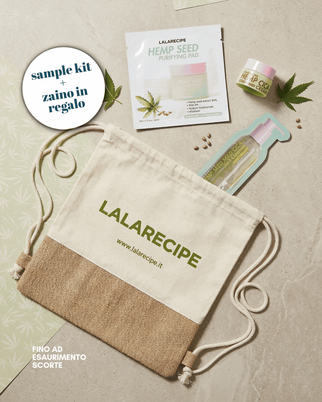 2 prodotti = Sample kit in regalo, 3 prodotti = Sample kit + zaino in regalo